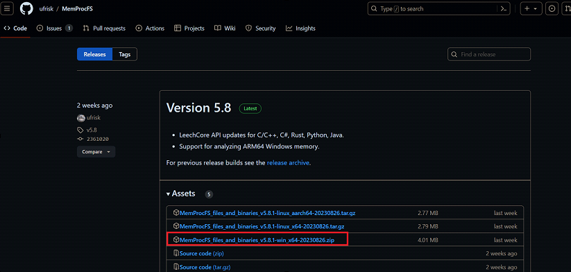 First, we go MemProcFS from the original GitHub repository (https://github.com/ufrisk/MemProcFS), and then we navigate to the Releases section to download the compiled Windows version.