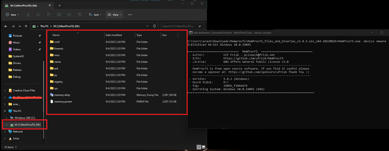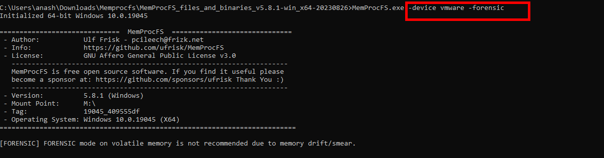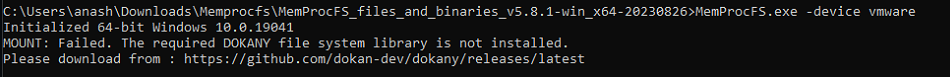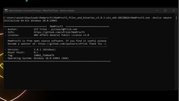 After downloading and extracting the folder, we spawn a privileged command prompt and run the following command MemProcFS.exe -device vmware to acquire VMware memory.