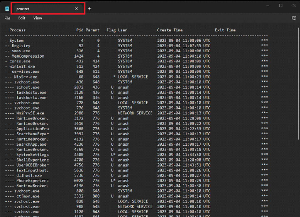 If you open the proc.txt file, you will find information about all running processes on the system. You can check parent-child relationships by counting the '-' characters.