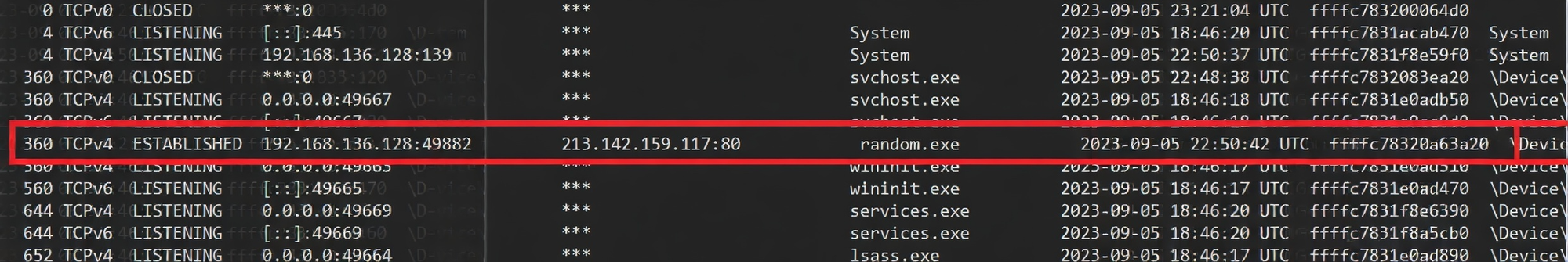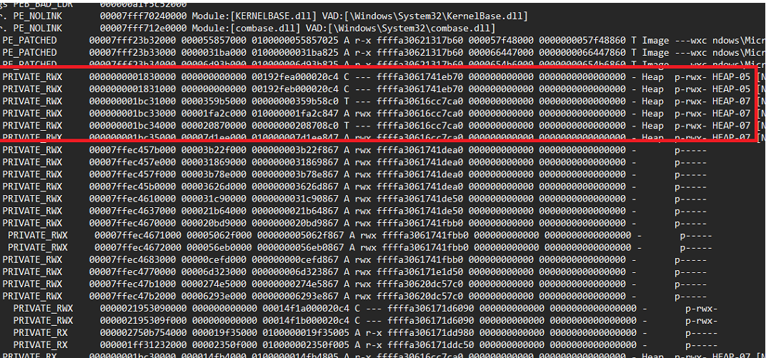 ⦁ E : Not in the EPROCESS linked list, possible rootkit or memory corruption.