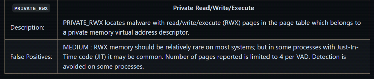 PRIVATE_RWX memory can indicate code injection, but it’s not conclusive, further analysis is required due to possible false positives.