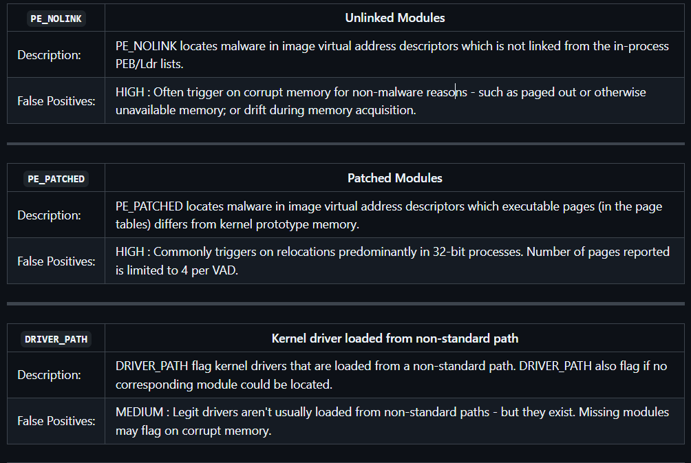 Numerous modules are available to assist in identifying potential threats. You can explore and discover these modules on the following resource: https://github.com/ufrisk/MemProcFS/wiki/FS_FindEvil.