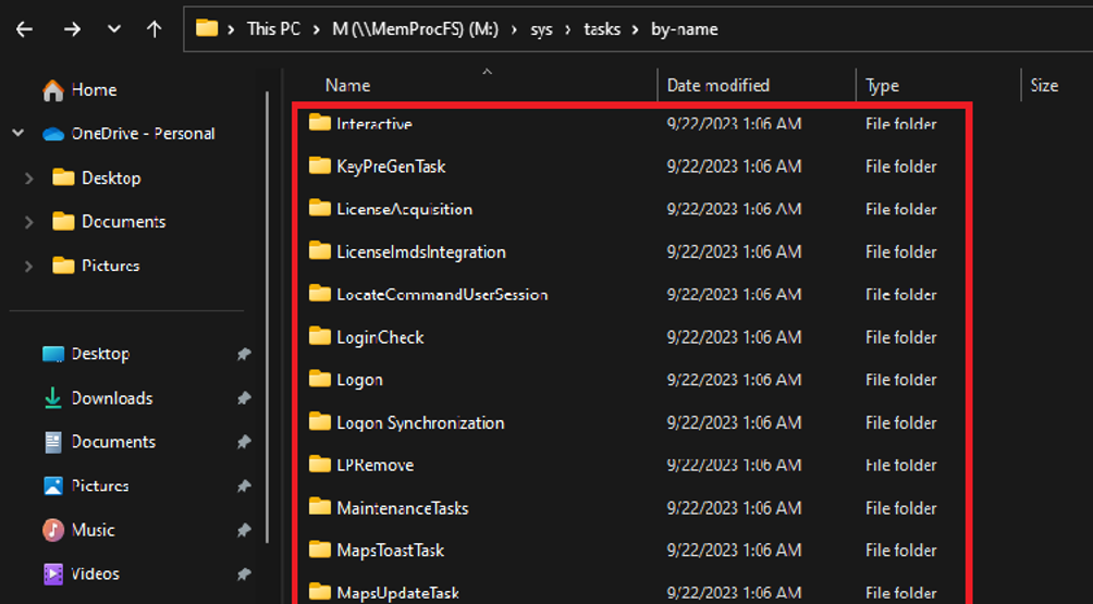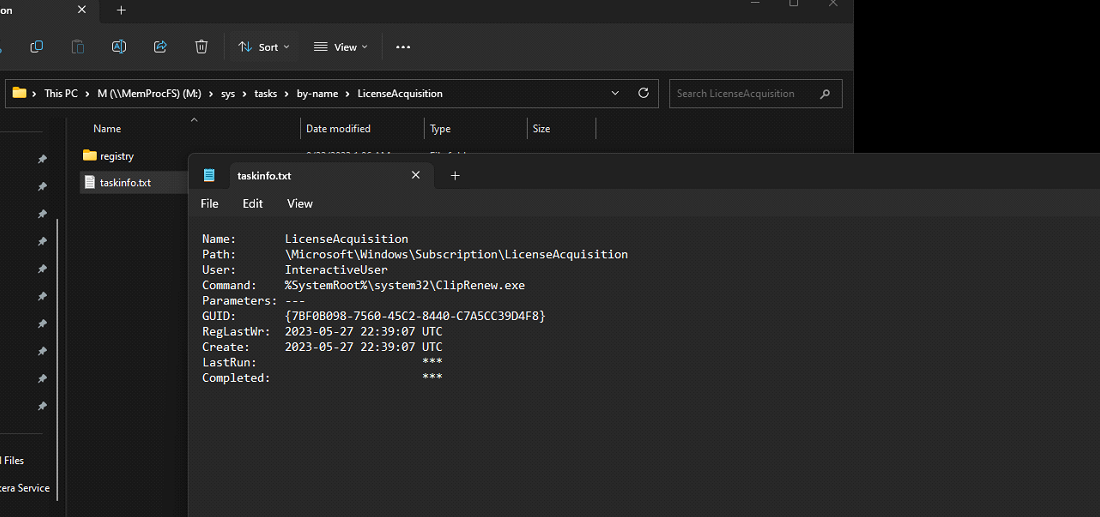 The directory at M:\sys\tasks\by-name contains information about scheduled tasks extracted from the registry.