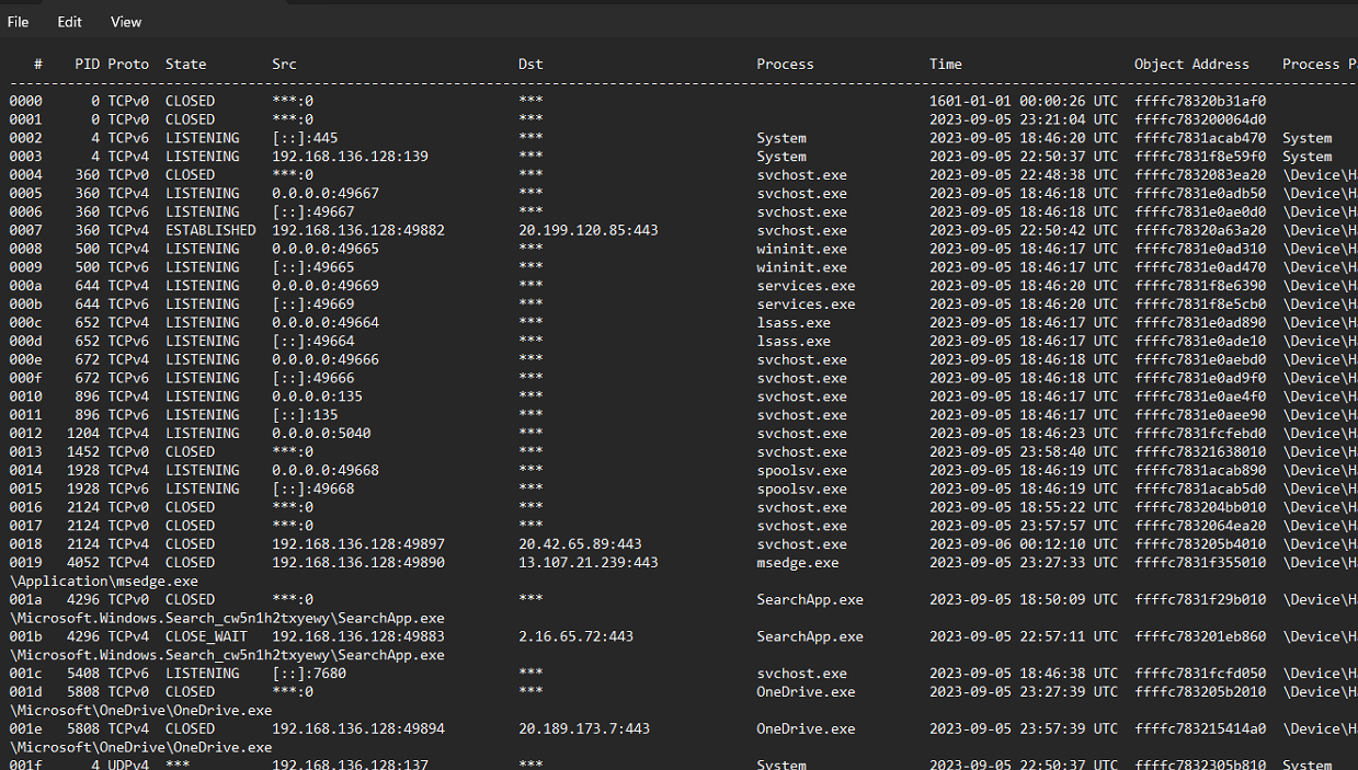 The output contains information like the netstat command. Note that this may not show all network connections due to timing acquisition.