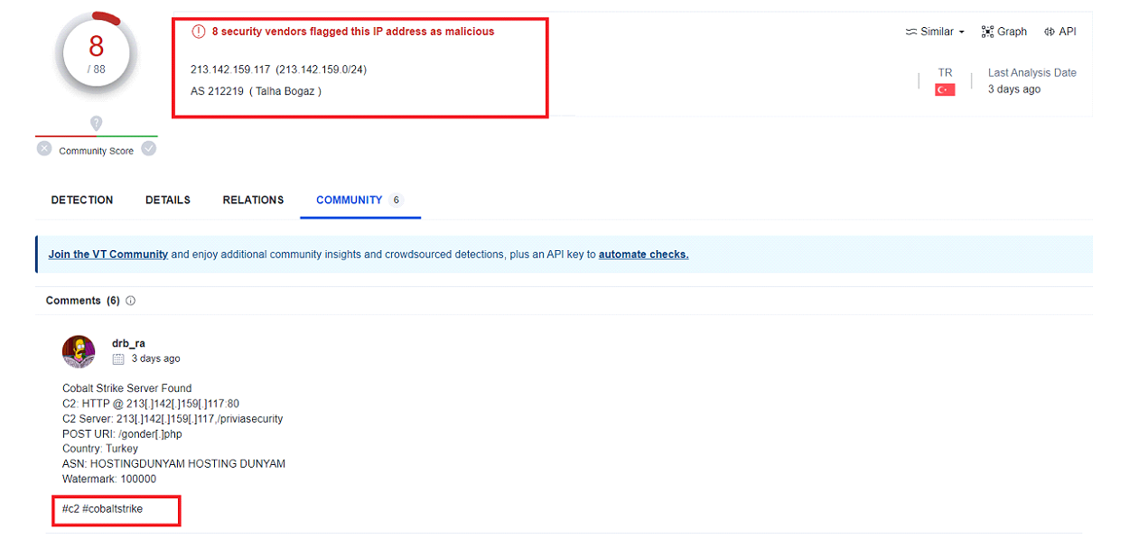 By searching the IP address on VirusTotal , we can see that this IP is already flagged and confirm that it is related to the Cobalt Strike C2. We can also use other search engines like abuseipdb.